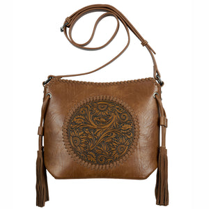 The Wrangler ALETA BAG, sized at 25cm (W) x 24cm (H) x 9cm (D), showcases a striking PU tooled front panel with suede whipstitch edging and side tassels. It offers secure storage with a top zip closure and a zippered back pocket.