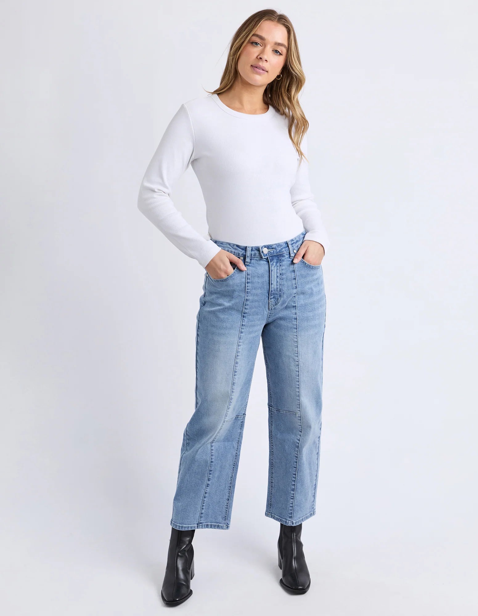 Say hello to your new favourite denim shape. The Ambrose Barrel Jean serves up that cool, curved leg silhouette with a comfy stretch feel—so you get structure and movement. Finished with a front button opening plus front and back pockets (because practicality matters), it’s the kind of jean that makes a basic tee look instantly styled.